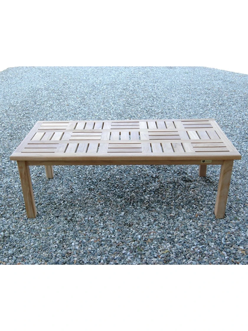 The classic basket-weave pattern of this coffee table will still be in style when trendy looks have come and gone. Note the thin channels in the pattern; they let rainwater drain away just as effectively as wide channels, but without making the surface precarious for beverages. This large rectangular table is sized for sofas or large benches.