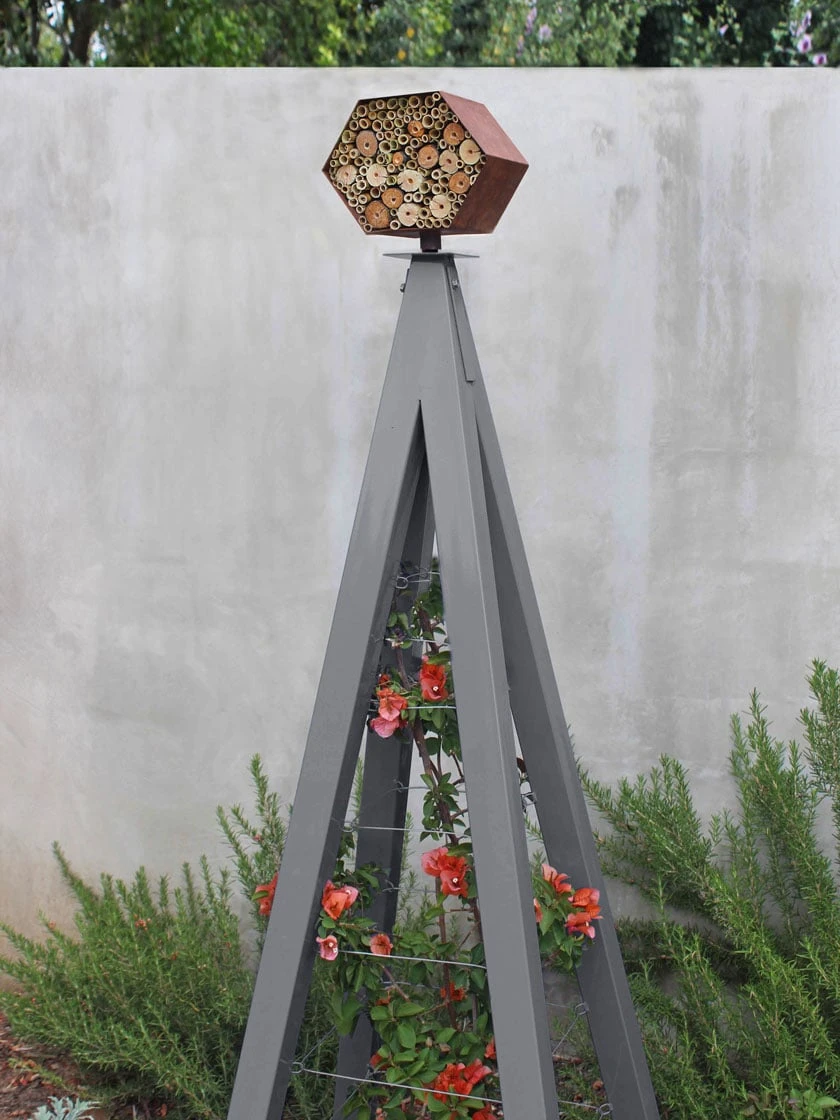 The Bee Bungalow together with the Akoris Garden Tuteur provides a modern/rustic habitat the hippest bees will buzz about! This combo is a perfect nesting opportunity for solitary native “super pollinators” you WANT in your garden! Made of natural oxidized steel, the bungalow contains hand-cut natural lake bed reeds and drilled-out branches with a variety of openings to make it easy for the bees to find their “home.” The trellis allows edible and ornamental plants to weave throughout, creating a spectacular tapestry while providing sturdy support..
