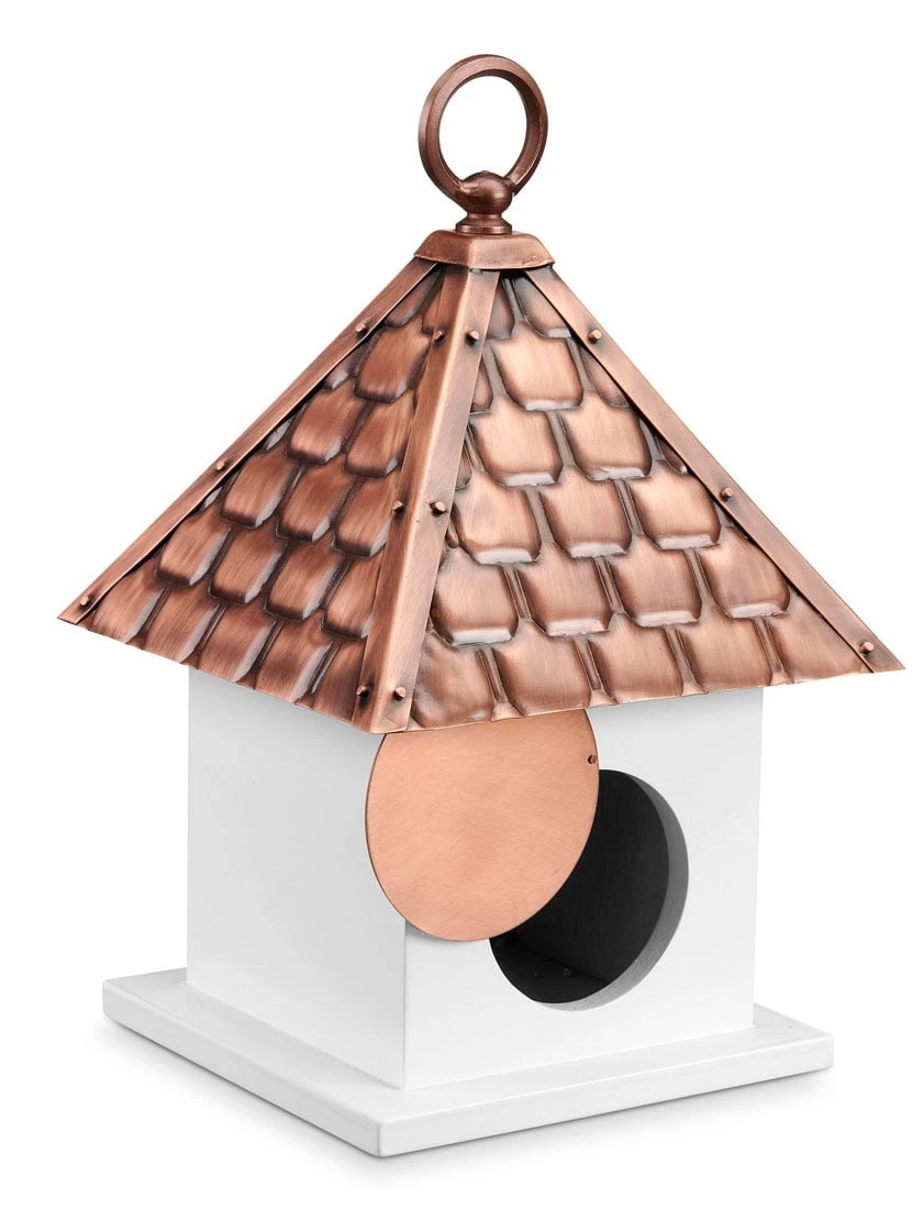 Friends of flight will find delight in this beautiful Bungalow Bird House painted white. Topped with a pure copper roof, birds are sure to set-up-shop here. Attracts small feathered-friends with a 1 1/8” entry. The perch-less entry protects from nest-raiding paws, giving birds the freedom to enjoy their home. The base is made of a long-lasting, mango hardwood with a generous 3” hole on back and sliding copper door making clean-up a breeze. Air vents circulate fresh air through the space and drainage holes are in the base.