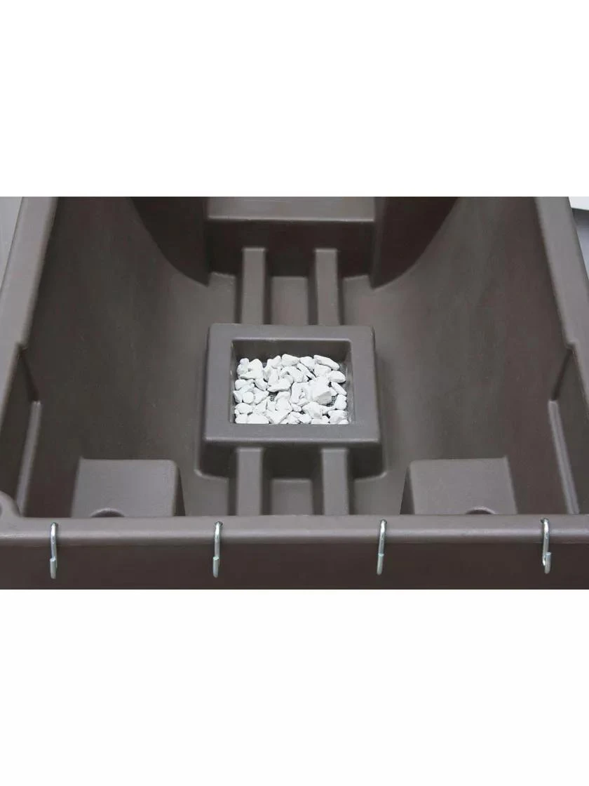 This self-watering elevated garden holds over 10 gallons of water. Raised for easy access without back pain. Includes potting gravel for self-draining functionality, and S-hooks for hanging accessories.
